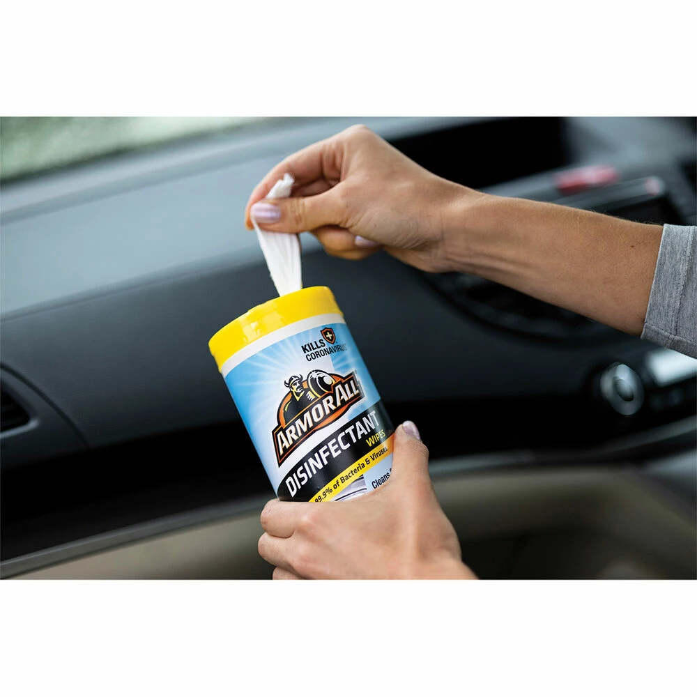 Armor All Disinfectant Wipes are made to provide quick cleaning, and disinfect frequently contacted surfaces in your vehicle. Dirt and germs can build up on frequently touched areas in the car such as the steering wheel, gear shift, entertainment console and door handles. Armor All Disinfectant Wipes kill Coronavirus* and other bacteria and viruses^ to keep your vehicle, boat, home, office or workshop clean and fresh.
