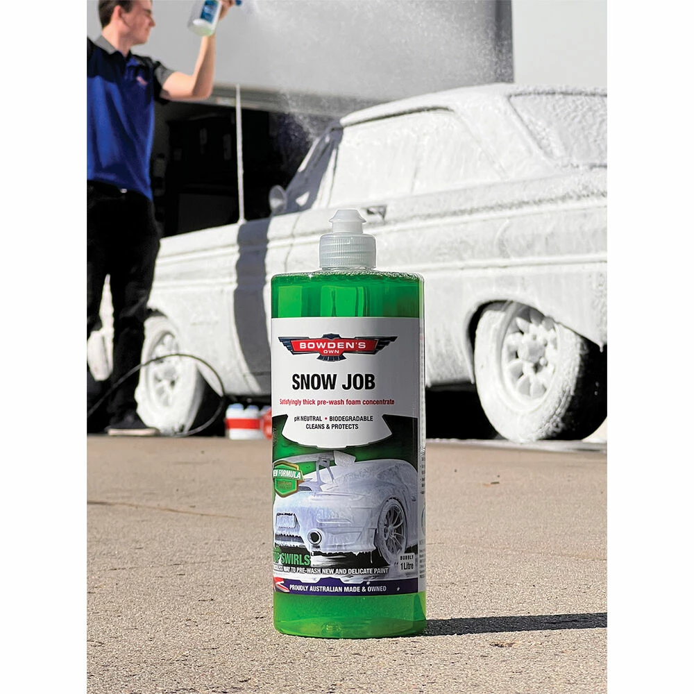 Bowden’s Own Snow Job is designed to be used with the Bowden’s Own Snow Blow Cannon. It’s a great touchless washing system which is easy to use. Just fill up to the recommended ratio 1:10, attach & spray. Adjust the cannon to the air & angle ratio preferred & you’re away. Once your car is covered in foam, let it sit for a bit, then de-attach the cannon & spray off. Use Snow Job touchless washing system to dramatically decrease the chance of getting any swirls or scratches when hand washing your car.